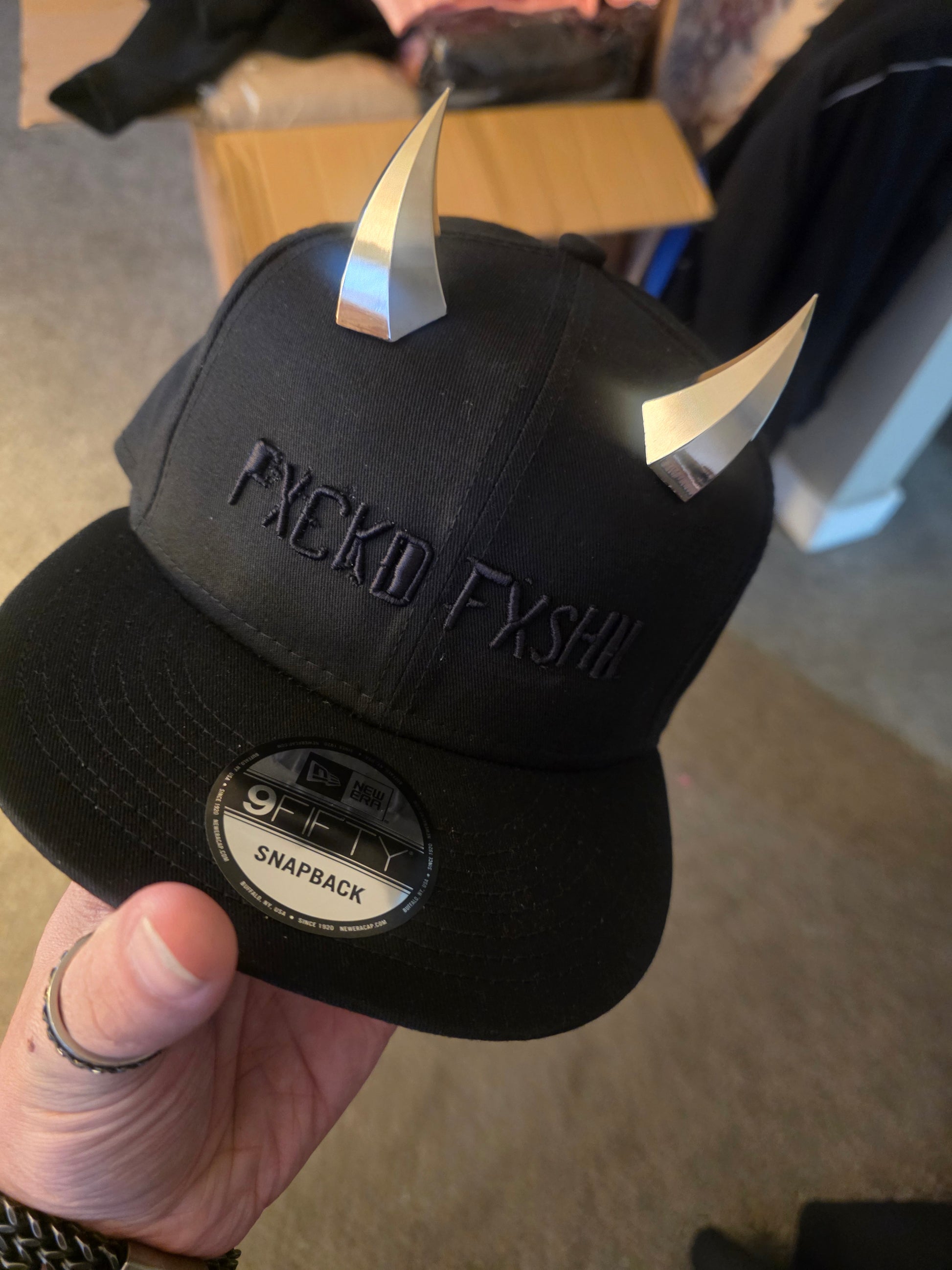 Here we have a black flat billed hat with FXCKD FXSHN in black or white. Horns are optional heavy solid stainless steel horns.